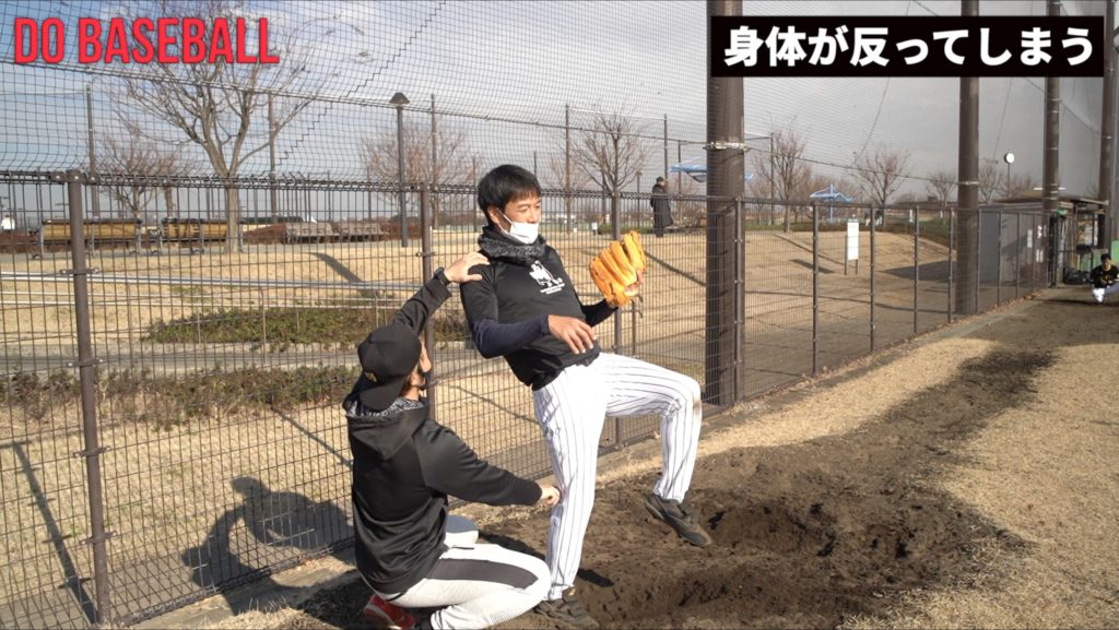 この選手は投球の際に足を上げた時に頭から進もうとしている状態にあり、